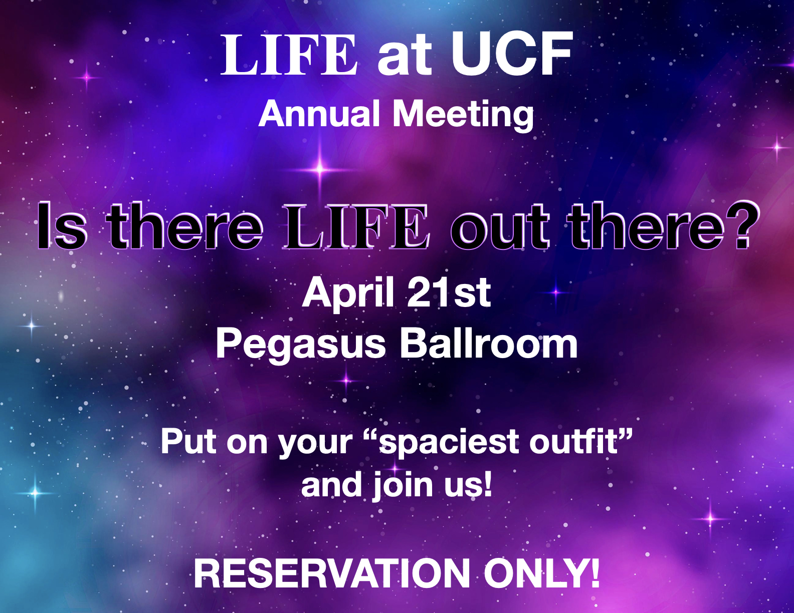 LIFE at UCF will be holding its Annual Meeting on Tuesday, April 21st at 8:45 AM in the Pegasus Ballroom immediately followed by our Volunteer and Honored Member Showcase & Celebration!