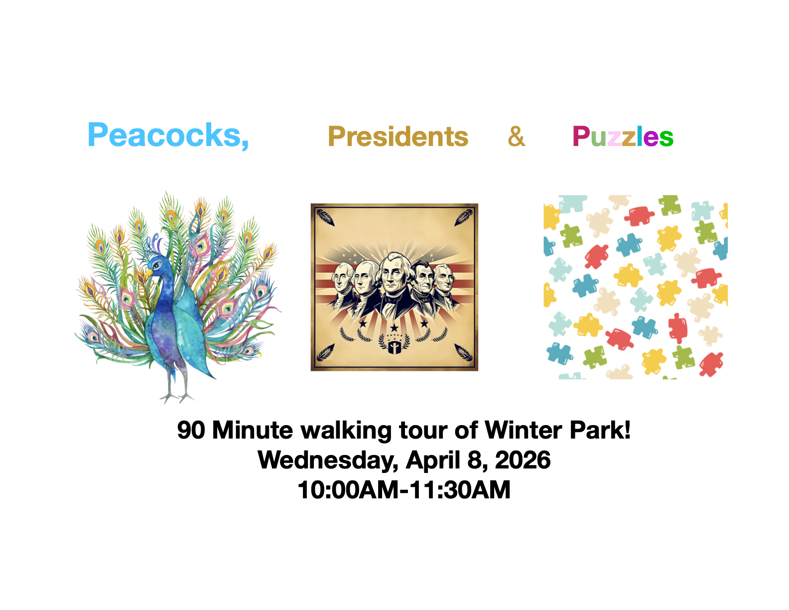 * We will explore nearly 140 years of rich history during our guided tour of this beautiful Central Florida Village created with European style! Join us for the fascinating history of the town, its famous visitors and even solve the mystery of the "Peacock" along the way! You will learn why this was Central Florida's original tourist destination as you visit sites that date back to the founding of the town. The tour will last 90 minutes, so be confident in your ability to walk/stand for that amount of time.