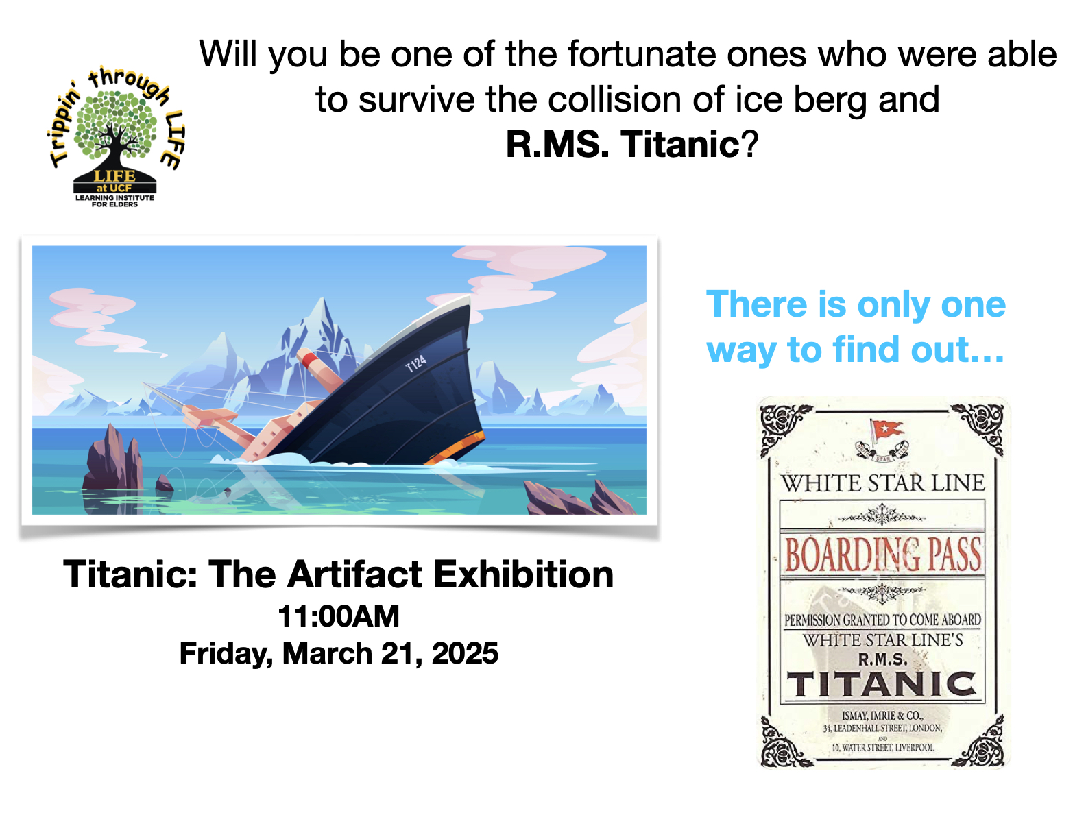 ALL ABOARD! Prepare to embark with other LIFE at UCF members. The museum is entirely indoors, however, there are no areas in which to sit while on this Trippin' through LIFE event. You might want to bring a lightweight jacket or sweater; of course, you are in the North Atlantic in April...it's chilly!